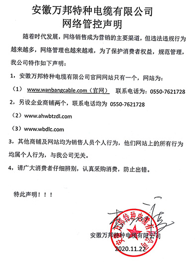 鄭重聲明:安徽萬邦特種電纜有限公司官方網站為:www_wanbangcable_com.629861.com,除此之外無任何子網站或合作網站,其余均為假冒偽劣。電話:0550-7621728 13485756353 地 址:安徽省天長市滁州高新技術產業開發區經四路29號